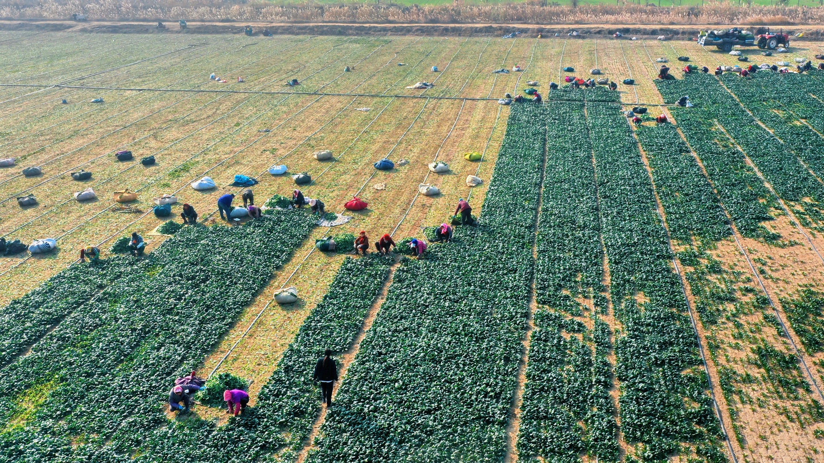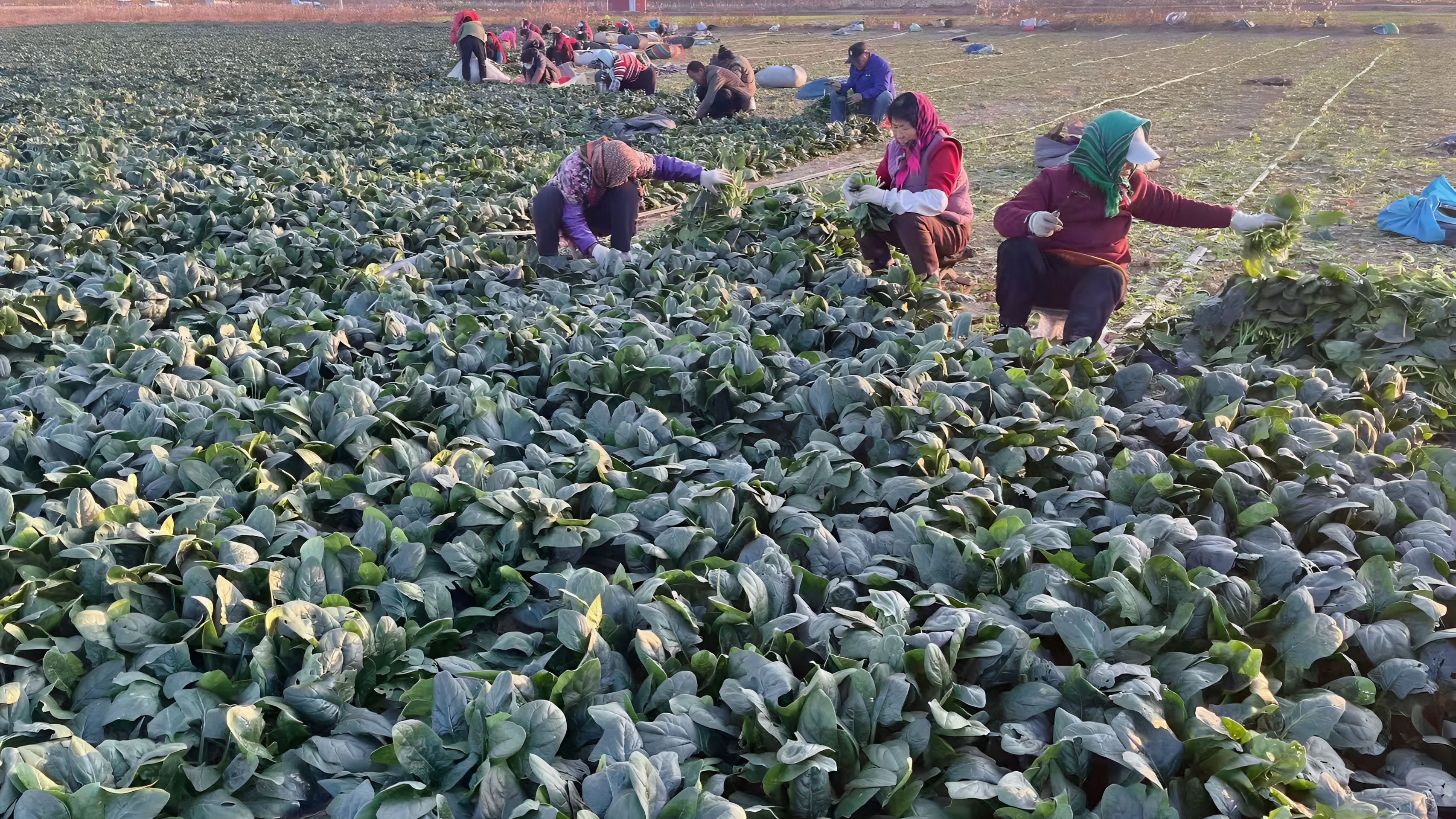初冬的嚴寒,澆不滅大家豐收的喜悅心情。此刻,在博華大片大片的菠菜試點種植區,幾十余畝訂單露天菠菜進入豐收季,一壟壟菠菜整齊排開,長勢喜人,組成一片片綠油油的菠菜田。多名采收工人正在低頭忙著鏟菜、打捆、裝運,呈現一派紅紅火火的繁忙景象。
